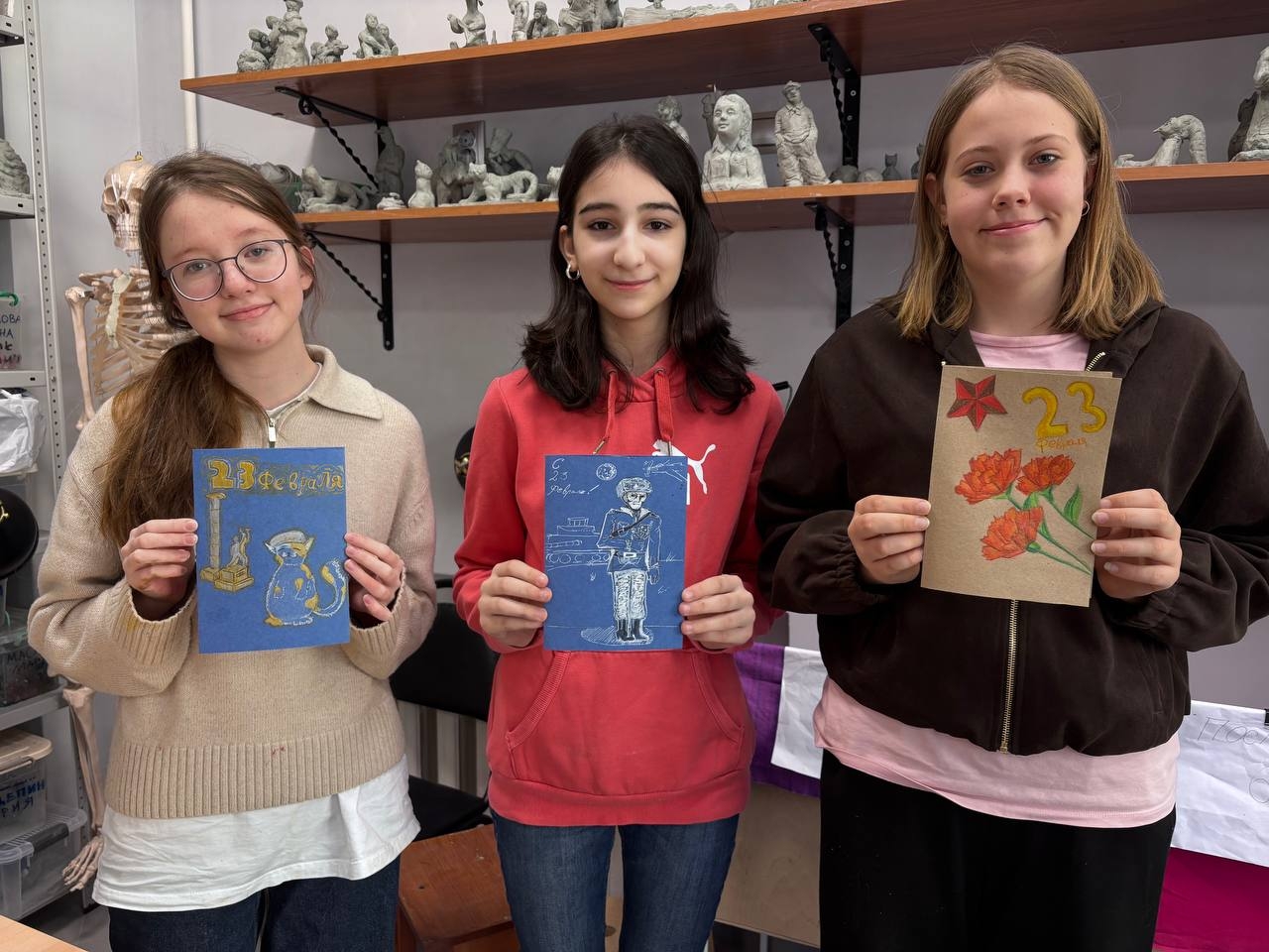 Учащиеся художественного отделения нашей школы своими руками создали поздравительные открытки для защитников Родины. От идеи и эскиза до готового рисунка и искренних пожеланий — в каждую работу вложена частичка детской души.