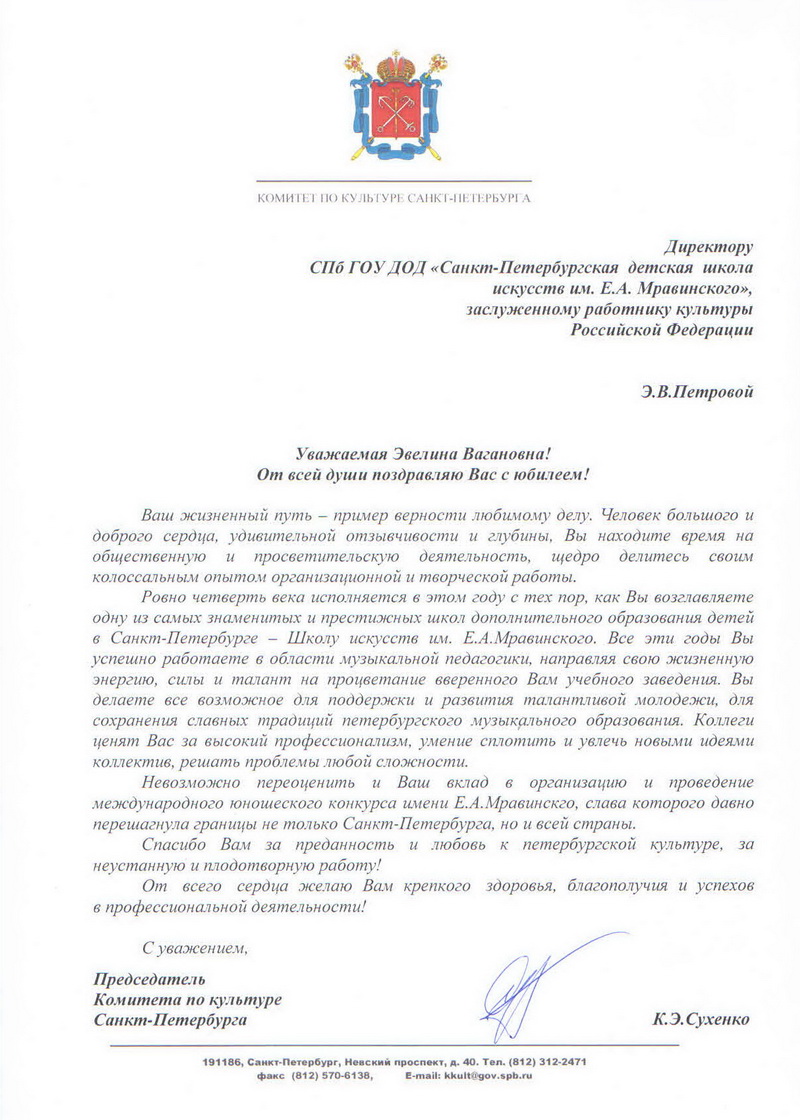 Поздравление Председателя Комитета по культуре Санкт-Петербурга К.Э.Сухенко