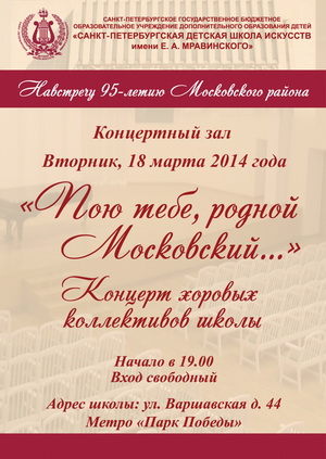 18 марта 2014 года в 19 часов в Концертном зале Санкт – Петербургской детской школы искусств им. Е. А. Мравинского состоялся большой праздничный концерт «Пою тебе, родной Московский….», посвященный 95-летию Московского района.